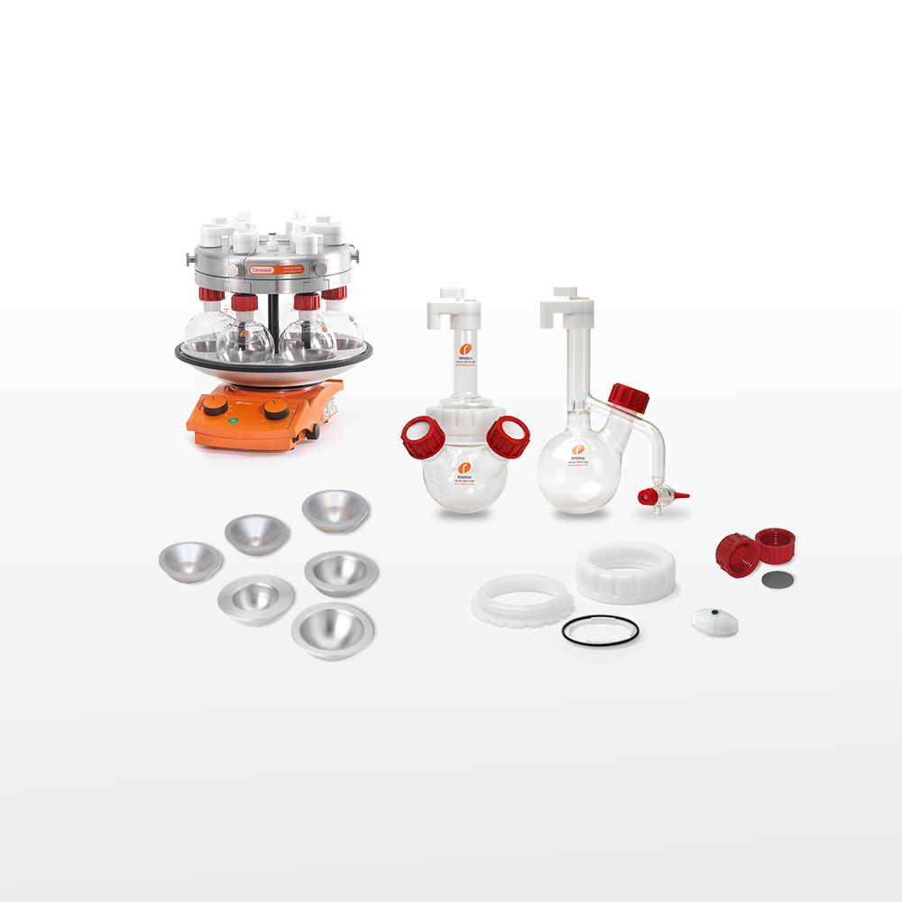 Easy-On PTFE reaction capsManufactured from chemically-resistant PTFE Attach using a 1/4 turn quick-thread Easy-On push connection to the Carousel’s radial gas system Caps feature a Suba-Seal silicone septa and on/off valve for isolation and removal Storage caps have septa, but no sidearm or valve Caps include a replaceable Nitrile O-ring with an optional Viton replacement Replaceable septa allow the addition of reagents or removal of samples All septa are silicone as standard (Viton is available) Carousel 6 Plus GlasswareStandard Flasks Choice of sizes: 5 ml, 10 ml, 25 ml, 50 ml, 100 ml, 170 ml and 250 ml Precision engineered round bottom design ensures an excellent fit with the Carousel’s wells, maximising heat transfer Flasks feature a B24/B29 Rodaviss joint for connection to the detachable Reflux Tube Reflux Tubes feature a quick-thread for an excellent gas tight seal up to 1 psi Optional single piece 250 ml Long Neck design Standard Flasks with Sidearms Flasks are available with B14/23 and B24/29 sidearm options and include Rodaviss caps and sealing septa Sidearms are compatible with Dropping Funnels and Solid Addition Funnels Azeotropic Flasks (Dean & Stark) Unique single piece flasks fit directly into the Carousel 6 Plus, allowing chemists to perform up to six Azeotropic processes in parallel Choice of sizes: 100 ml and 250 ml Special Tornado version to accept centrifugal stirring paddle Replaceable PTFE stopcock for removal of the aqueous phase Wide Neck flasks with quick coupling Wide neck flasks allow easier removal of viscous or solid samples and facilitate the use of the anchor and propeller style PTFE stirrer blade options (Tornado) These unique vessels feature a 50 mm ID flat flange, which combines with a Nitrile O-ring and our unique self centering PTFE collar to offer a leak-tight seal between the glass flask and wide neck reflux tube. The two flanges are compressed together using a two part threaded polymer coupling, which both holds the components rigid and offers an excellent gas tight seal Wide Neck flasksWide Neck flasks with Sidearms One or two sidearms ideal for attaching dropping funnels or powder funnels. Wide Neck flasks with Baffles and Sidearms Baffled flasks improve the turbulence within the flask by disrupting the creation of a central vortex. The range Downloadable resources Easy-On PTFE reaction caps RR91070 Easy-On PTFE Cap, Pack 6 RR91072 Easy-On PTFE Storage Cap, Pack 6 RR98076 Silicone Septa for PTFE Caps, Pack 100 RR98176 Viton Septa for PTFE Caps, Pack 100 Standard Flasks and Reflux Tubes RR99151 5ml Reaction Flask with B14/23 Neck, Pack 6 RR99148 10ml Reaction Flask with B14/23 Neck, Pack 6 RR99923 B14/23 Reflux Tube + Connecting Set, Pack 6 RR99145 25ml Reaction Flask, Pack 6 RR99070 50ml Reaction Flask, Pack 6 RR99054 100ml Reaction Flask, Pack 6 RR99052 170ml Reaction Flask, Pack 6 RR99041 250ml Reaction Flask, Pack 6 RR99917 250ml Reaction Flask + Reflux Tube + Connecting Set, Pack 6 RR99918 B24/29 Reflux Tube + Connecting Set, Pack 6 RR99919 250ml Long Neck Reaction Flask, Pack 6 Standard Flasks with Sidearms RR99071 50ml Reaction Flask with B14/23 Sidearm + Septa Port, Pack 6 RR99074 100ml Reaction Flask with B14/23 Sidearm + Septa Port, Pack 6 RR99077 250ml Reaction Flask with B24/29 Sidearm + Septa Port, Pack 6 RR99047 250ml Reaction Flask with B14/23 Sidearm + Septa Port, Pack 6 RR99087 250ml Reaction Flask with 2x B14/23 Sidearms + Septa Port, Pack 6 RR99088 250ml Reaction Flask with 2x B24/29 Sidearms + Septa Port, Pack 6 RR99089 250ml Reaction Flask with 1x B14/23 + 1x B24/29 Sidearm + Septa Port, Pack 6 Wide Neck Flasks with Coupling RR99924 Wide Neck Reflux Tube + Coupling RR99925 Coupling for Wide Neck Flasks RR99940 PTFE Wide Neck Support Collar RR99941 Nitrile O-Ring for PTFE Wide Neck Support Collar RR99926 50ml Wide Neck Flask RR99928 100ml Wide Neck Flask RR99933 250ml Wide Neck Flask Wide Neck Flasks with Sidearms RR99927 50ml Wide Neck Flask with B14/23 Sidearm + Septa Port RR99929 100ml Wide Neck Flask with B14/23 Sidearm + Septa Port RR99930 100ml Wide Neck Flask with 2x B14/23 Sidearms + Septa Port RR99934 250ml Wide Neck Flask with B24/29 Sidearm + Septa Port RR99935 250ml Wide Neck Flask with 2x B24/29 Sidearms + Septa Port Wide Neck Flasks with Baffles & Sidearms RR99931 100ml Baffled Wide Neck Flask with B14/23 Sidearm + Septa Port RR99932 100ml Baffled Wide Neck Flask with 2x B14/23 Sidearms + Septa Port RR99936 250ml Baffled Wide Neck Flask with B24/29 Sidearm + Septa Port RR99937 250ml Baffled Wide Neck Flask with 2x B24/29 Sidearms + Septa Port Azeotropic Glassware RR99922 100ml Azeotropic Reaction Flask, Pack 3 RR99920 250ml Azeotropic Reaction Flask, Pack 3 RR99939 100ml Tornado Azeotropic Reaction Flask, Pack 3 RR99938 250ml Tornado Azeotropic Reaction Flask, Pack 3 Liquid and Solid Additions Funnel RR99049 B14/23 Solid Additions Funnel, Pack 3 RR99079 B24/29 Solid Additions Funnel, Pack 3 RR99048 B14/23 Liquid Additions Dropping Funnel + Pressure Equalising Arm, Pack 3 RR99078 B24/29 Liquid Additions Dropping Funnel + Pressure Equalising Arm, Pack 3 Evaporation Adapters, Splash Heads and Evaporation Flasks RR99045 Rotary Evaporator Adapters Rodaviss B29 Socket to B24 Cone, Pack 2 RR99046 Rotary Evaporator Adapters Ordinary B29 Socket to B24 Cone, Pack 2 RR99055 Rotary Evaporator Adapters USA 24/40 Socket to B24 Cone, Pack 2 RR99083 Splash Head Rodaviss B29 Socket to B24 Cone RR99084 Splash Head Ordinary B29 Socket to B24 Cone RR99085 Splash Head USA 24/40 Socket to B24 Cone RR99053 250ml EZ-2/HT Evaporation Flask (Compatible with Genevac Evaporators), Pack 4 Flasks are NOT supplied with reflux tubes or PTFE caps, these must be purchased separately Aluminium Inserts RR99142 Aluminium Insert for 5ml Reaction Flask, Pack 6 RR99141 Aluminium Insert for 10ml Reaction Flask, Pack 6 RR99140 Aluminium Insert for 25ml Reaction Flask, Pack 6 RR99060 Aluminium Insert for 50ml Reaction Flask, Pack 6 RR99058 Aluminium Ins