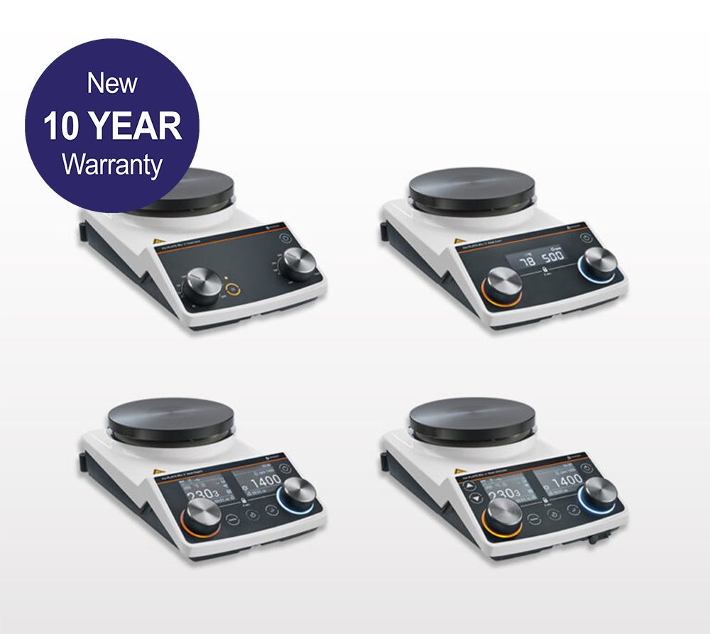 Hei-PLATE Stirring Hotplates 3 Year Warranty Hermetically sealed, die-cast aluminium housing prevents electrical components from solvent and vapour ingress Suitable for continuous unattended operation Chemically resistant Kera-Disk top plate coating, comprised of aluminum body with ceramic coating for fast heat up times as well as high chemical resistance 145 mm top plate diameter 4 models to choose from 800 watts of heating power Hotplate temperature range: 20 to 350 °C Speed range: 30 to 1400 rpm Stir up to 20 L volumes Independent safety circuit will switch off heating if hotplate temperature exceeds 25 °C over set temperature Control by reaction temperature using a Pt1000 temperature sensor or EKT Hei-CON Residual heat indicator helps prevent accidental burns by flashing orange when the plate is hotter than 50 °C, even when unit is switched off Ultimate model has RS232 and USB-B connectivity for software control Book an online demo Leading Safety StandardsReduced Cost of OwnershipSuperior Ease of UseIntroducing the range... Hei-PLATE Heat 'n' Mix CoreFor simple heating and stirring applications Simple operation – One dial for heating, one for stirring A separate on/off switch for heating prevents an unintentional heat-up. If heating is switched on the on/off button is illuminated for visual control A residual heat indicator prevents from burning hazards when heat function is switched off Analog knobs allow for convenient speed setting from 100 to 1,400 rpm and temperature setting up to 300 °C Hei-PLATE Heat 'n' Mix Core+For tasks which require heating with process control Digital display for precise setting and monitoring of all parameters Combine with a Pt1000 temperature probe for control of the heating by process temperature Two heating modes – Fast heatup with minimal overshoot of set temperature or Precise heatup with no overshoot To protect your sample from overheating a safety circuit switches off heating if the temperature sensor is not immersed in your media vessel Temperature and stirring control knobs feature LED rings which illuminate when the function is active Hei-PLATE Mix 'n' Heat ExpertFor high-precision temperature control with a timer function Keep an eye on all values thanks to dedicated temperature and stirring displays Timer function allows for safe, unattended chemistry Protect your samples from temperature overshoot with the PRECISE+ temperature ramp setting Automatic stirrer bar detection to minimise decoupling Hei-PLATE Mix 'n' Heat UltimateFor future-proofed working and software control The RS232 and USB B interfaces allow automation and data logging Integrate the device into a network with the Ethernet port Combine with the e-Lift electric lab jack and control using the USB C connection Hei-PLATE AccessoriesA range of complementary accessories Stirring bars Silicone protective covers Pt1000 clamping systems Pt1000 temperature sensors e-Lift electric lab jack EKT Hei-CON Hei-PLATE: Built to last The warranty on all new hotplates extended to 10 years. Free replacement parts Priority repair service Complimentary software updates Key features Videos Downloadable resources Blog Hermetically-sealed housing protects all mechanical and electronic components from aggressive environments In case of a short circuit, a damage or removal of the temperature sensor from the media, the unit powers off completely Damage to the stirrer is categorically ruled out even if exposed to highest temperatures - all models come with a fire-resistant aluminium die-cast housing A separate on/off button for heating prevents unintentional heat-up - the button is illuminated for visual control. The residual heat indicator prevents from potential burning hazards. The temperature sensor consists of two independent safety circuits which switches off heating in case of any over temperature situation In case the heating function fails, stirring will not be discontinued to prevent bumping The extended heating capacity of 800 W reduces heat-up times by 35% compared to other units at 600 W The chemically resistant Kera-Disk® hot plate allows for immediate heat transfer resulting in quick heat-up times Click to download these resources Heidolph Magnetic and Powerful Stirrers Brochure Find Out More Heidolph Solutions overview Find Out More Radleys International Product Guide Find Out More Hei-PLATE MixnHeat Core+ – At a Glance Find Out More Hei-PLATE MixnHeat Expert – At a Glance Find Out More Hei-PLATE MixnHeat Ultimate – At a Glance Find Out More How Radleys can help you reduce your carbon footprint Find Out More Green chemistry – how to make your lab a greener, cleaner place Find Out More How do you increase the productivity of your chemistry? Find Out More How lab control software can make a chemist’s life easier Find Out More Simple tips for saving money in your lab Find Out More For chemical synthesis, process development, evaporation and work-up Browse the range Explore the range Heat-On Block System Find Out More Findenser Super Air Condenser Find Out More Cool-It Bowl – Insulated Bowls Find Out More View all products
