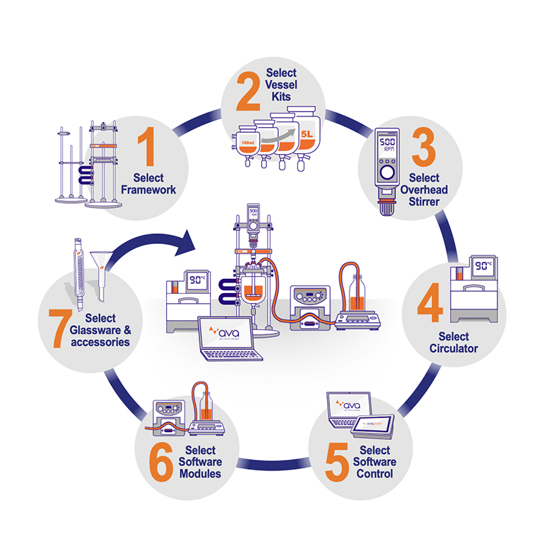 7 simple steps 1. Select FrameworkStart by selecting one of two Reactor-Ready Flex frameworks: Reactor-Ready Flex Pro – Feature-rich for maximum flexibility and rapid vessel exchange. Ideal for saving space, time and money with a single workstation, as you can swap vessels in minutes and without tools to suit multiple projects or scales. Reactor-Ready Flex Starter – A streamlined option, with core functionality for more limited budgets. Ideal if you don’t need to swap vessels regularly as it retains most of the design features of the Pro configuration, minus some of the features related to rapid vessel exchange. 2. Select Vessel KitsReactor-Ready Flex accepts vessels from 100 ml to 5 L, which are designed for excellent heat transfer and mixing. Choose between single and vacuum jacketed vessels, with the same scale-up-friendly geometry (1.25:1 height-to-diameter ratio) across the range. Vessel kits simplify ordering vessels and accessories. Each kit includes a temperature probe and adapter, as well as an impeller matched to the vessel, making it easy to maintain uniform mixing across the volume range. 3. Select Overhead StirrerReactor-Ready Flex is compatible with any brand of overhead stirrer that accepts a 10 mm OD shaft. Radleys recommend and supply the Heidolph Hei-TORQUE range, with options to suit applications from small to large scale, and low to high viscosity. See Overhead Stirrers 4. Select CirculatorPaired with the appropriate circulator / thermoregulator, Reactor-Ready Flex can be temperature-controlled between -70 °C and +230 °C jacket temperature. We recommend and supply the Huber range, however Reactor-Ready Flex is compatible with any brand of circulator with the correct hoses and adapters. When purchasing a full solution from Radleys, our technical specialists can help with specifying the appropriate circulator for your application. See Circulators 5. Select Control SoftwareFor enhanced safety, precision, and reproducibility, you can add AVA reaction control software. AVA allows you to easily control and log multiple devices from an array of leading manufacturers and instantly create detailed reports at the end of your experiment. See AVA Software 6. Select Software ModulesExtend the power of AVA with optional software modules such as a pH module, Gravimetric Additions, Syringe Pump Additions, and more. Download device drivers 7. Select Glassware & AccessoriesFinish your setup with glassware and accessories from our extensive range. Options include: Glassware such as condensers, funnels, adapters, reflux dividers Temperature probes, stirrer shafts, PTFE lids, baffles, and more Custom-made glass components from our expert glassblowing team Want to discuss Reactor-Ready with an expert? Book a demo