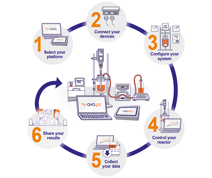 6 simple steps Select your platformStart by selecting one of two AVA platforms: AVA Pad Reactor Controller Compact all-in-one reactor controller. Control any Jacketed Lab Reactor with one simple touch screen. AVA PC Reaction Control Software PC-based reaction control software. Control up to 4 reactors at once. Connect your devicesConnect up to 16 devices from leading manufacturers. Common devices include; Circulators, Overhead Stirrers, Pumps, Balances and other sensors e.g. pH and temperature. Configure your systemLink devices for advanced control. Select, assign location and rename devices Set or modify parameters and safety limits Link devices for dual control e.g. pump and balance for gravimetric additions Control your reactorChoose between two control options for your reactor: Manual Control Direct control with tracked changes. Make changes as you go, while AVA records what you do, as you do it. Schedule Control Automate your process from start to finish. Create ramps, plateaus and timed actions. Define step end conditions and assign safety feedback loops e.g. control addition by process temperature. Collect your dataSee your data clearly and easily with automated data logging of all process parameters. View real time data and graphs, defining what you want to display Zoom in to inspect results closely View the event log and add comments Share your resultsCreate and share your results with detailed reports in just a few clicks. Choose what data to include Save reports in rich text format Export all data in a CSV Share experiments with other AVA users Want to discuss AVA Software with an expert? Book a demo